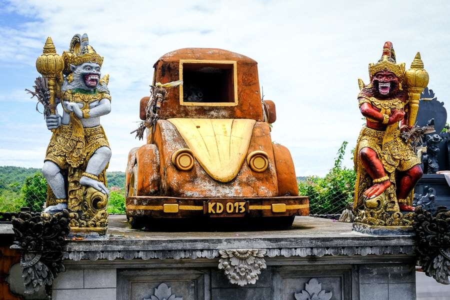 Paluang Temple Nusa Penida. It is also known as the car temple, because the shrine in this temple is in the form of a car. This temple which is located on the high seas has the difference that it has 13 pelinggihs and 2 of them have 2 pelinggihs in the form of VW Beatle and Jimmy cars. And this temple is the only one in the world that has a pelinggih in the form of a car and becomes its attraction.